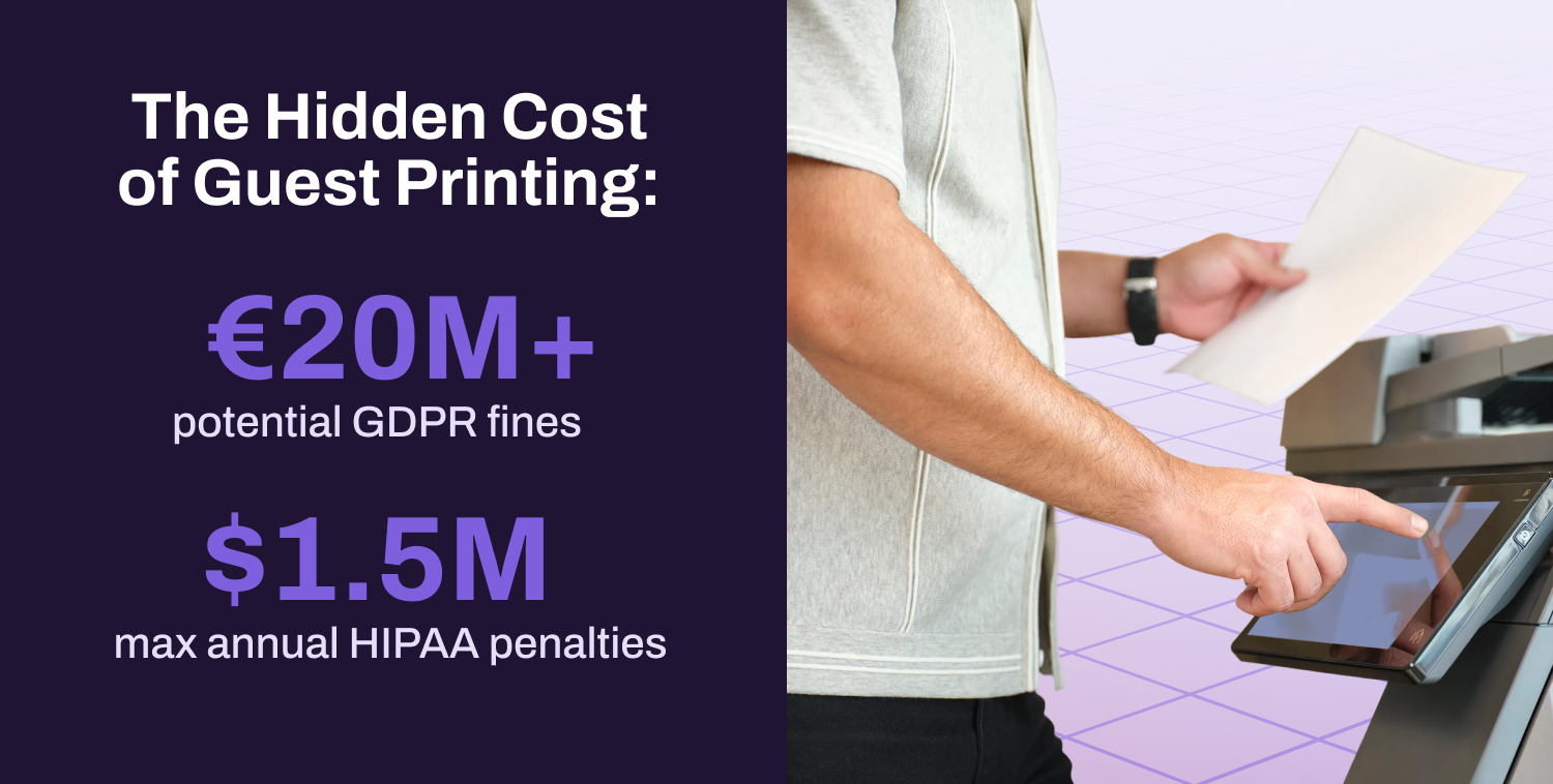 Compliance adds another layer of concern. Unattended documents at shared printers can expose sensitive information, potentially triggering HIPAA or GDPR violations with significant financial penalties. GDPR fines can reach up to €20 million or 4% of annual global revenue, whichever is higher. HIPAA violations range from $100 to $50,000 per incident, with severe violations reaching up to $1.5 million annually. For organizations in healthcare, finance, or legal sectors, unsecured guest printing isn't just an inconvenience; it's a liability.