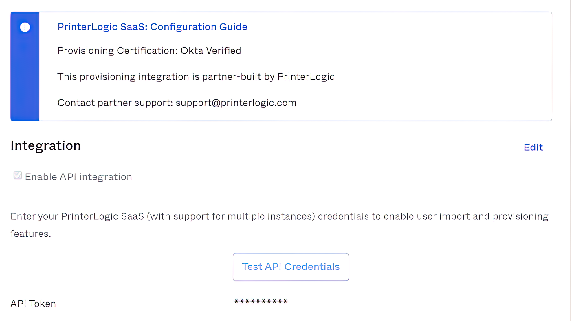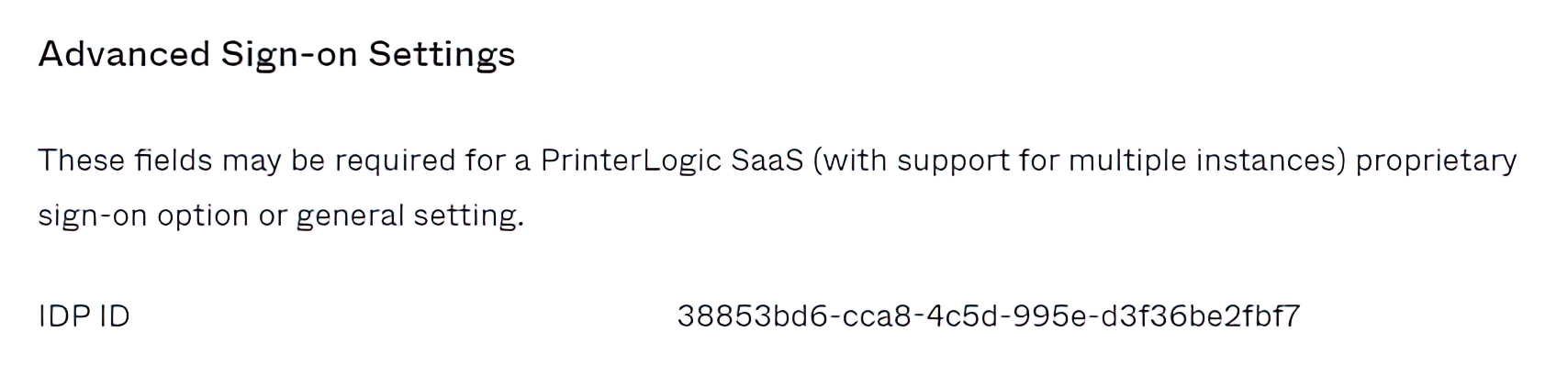 Setting up SCIM is fairly straightforward. First, the SP needs to provide the link to their SCIM client and a SCIM token. Every Service Provider creates a small software client (called a tenant) to receive SCIM information. For example, PrinterLogic provides the SCIM tenant on Tools>Settings>General>IdP Settings, as shown in the image below.