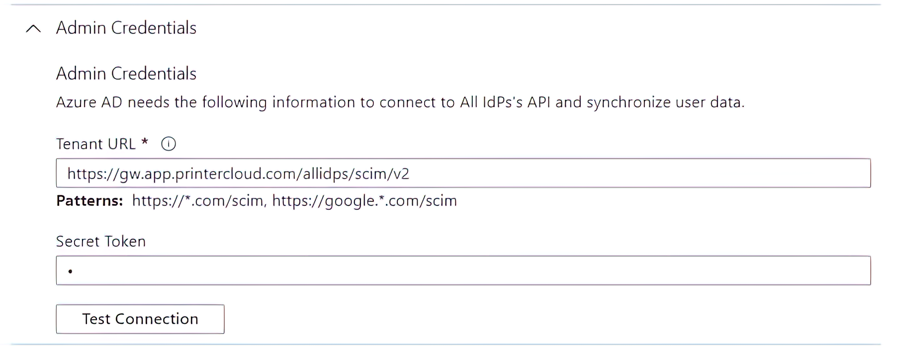 In Microsoft Azure, the SCIM tenant URL and token are easily identified under the Admin Credentials pane.
