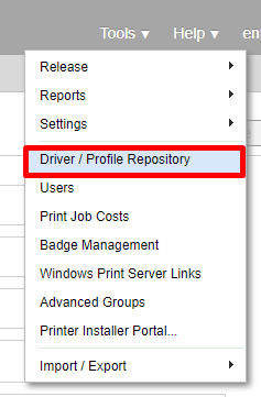 - The best thing you can do at this point is add drivers to the PrinterLogic repository. You can locate and upload drivers by going to “Tools > Driver/Profile Repository” in the Administration webpage.