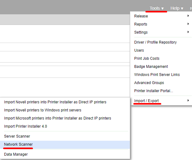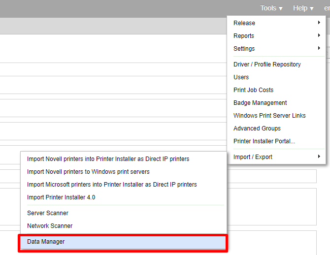 - Finish by going to the PrinterLogic Administration webpage and select “Tools > Import/Export > Data Manager”